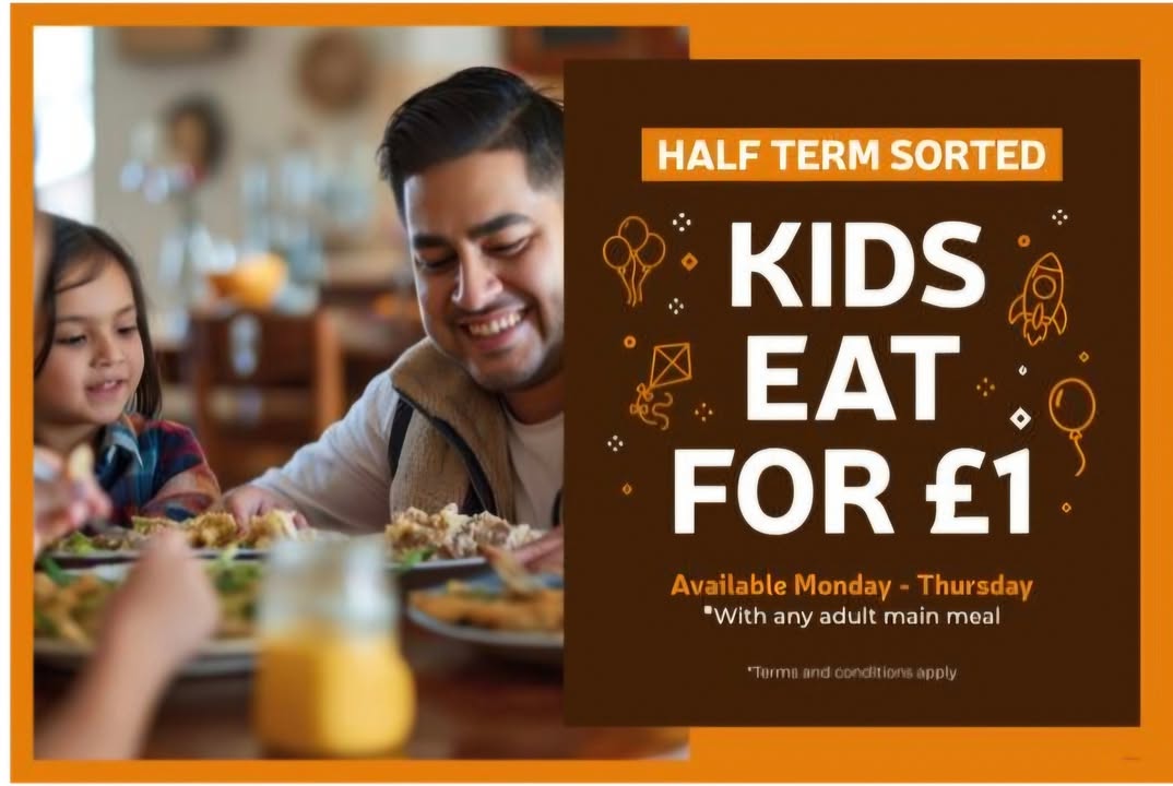 This half-term, treat the little monsters without scaring your wallet. Monday to Thursday, all kids eat for just £1 with any adult main meal. Bring the family, fill their tummies, and keep your pennies for the pumpkins.